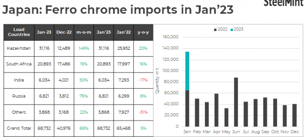 Japan: Ferro chrome imports surge 68% m-o-m in Jan’23