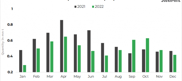 - Japan’s scrap exports dropped by 14% to 6.07 mnt in CY’22 compared to 7.02 mnt in CY’21, as per SteelMint’s data.