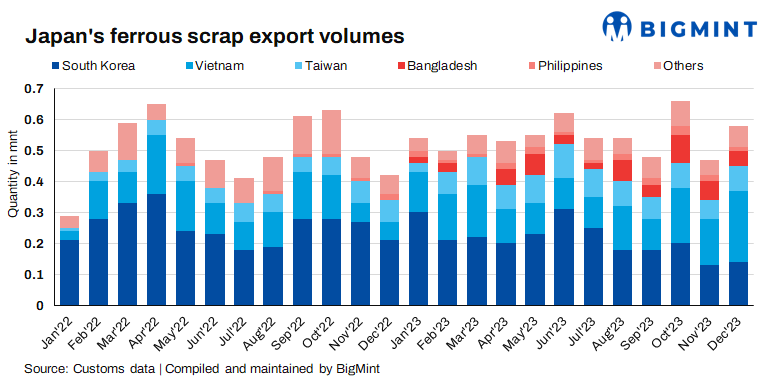 South Korea: Scrap exports from Japan to South Korea witnessed a 17% decline, reaching 2.54 mnt in CY’23 compared to 3.06 mnt in CY’22. In December, scrap exports increased to 0.14 mnt, showing an 8% rise from the previous month’s 0.13 mnt. However, this figure represented a notable 33% decrease compared to the 0.21 mnt recorded in the corresponding period of the previous year.