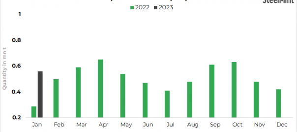 - Japan’s scrap exports recovered by 33% to 0.56 mnt in Jan’23 compared to 0.42 mnt in Dec’22, as per SteelMint’s data.