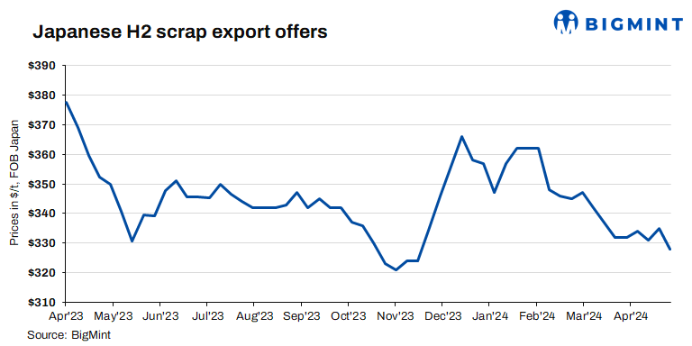 According to BigMint’s latest assessment, Japanese H2 scrap export offers stood at JPY 51,400/tonne (t) ($328/t) FOB Tokyo Bay, down JPY 400/t ($3/t) as against JPY 51,800/t ($331/t) FOB a week ago.