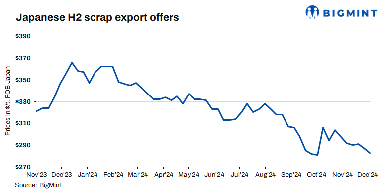 Japanese H2 scrap export offers fell by $3/t this week due to a combination of factors, including low demand, high freights, and bearish market sentiments. Vietnam, a key buyer, saw sluggish interest, as mills awaited greater price clarity amid reduced domestic construction activity and financial constraints. The appreciation of the JPY further pressured Japan’s FAS prices, while competitive alternatives and risks with the procurement of deep-sea cargoes shifted buyer interest away from the country.