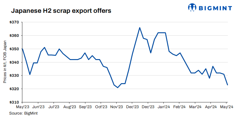 As a result, BigMint’s weekly Japanese H2 scrap export offers stood at JPY 50,700/tonne ($323/t) FOB Tokyo Bay, down by JPY 1,200/t ($8/t) from JPY 51,900/t ($331/t) FOB the previous week.