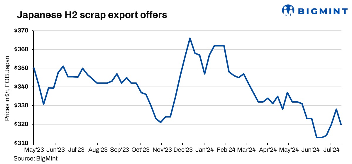 This week, Japanese H2 scrap export offers experienced a significant drop of around JPY 1,700/tonne (t) due to subdued demand from key importing nations amid a slowdown in the domestic steel market and bid-offer gap, coupled with a sharp appreciation of the JPY against the US dollar.