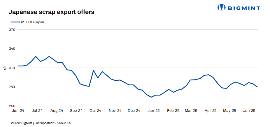 BigMint’s weekly assessed FOB Tokyo Bay prices of H2 scrap were down by JPY 1,000/t ($7/t) w-o-w to JPY 40,500/t ($280/t), reflecting the softer outlook. “We are in a wait-and-watch phase,” another trader added, pointing to limited trade activity and cautious pricing behaviour.