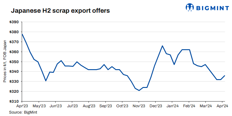 This week, export offers for Japan’s H2 scrap increased, propelled by optimistic forecasts for late April and May shipments. Increased interest from Vietnam and Taiwan, expecting further price hikes in line with global trends, also played a role. Additionally, improved realisations in the domestic market contributed to the price hike, prompting some Japanese suppliers to redirect their focus towards domestic sales.