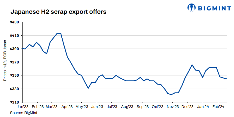 The export offers for Japan’s H2 scrap remained steady throughout the week, with opposing pressures from both buyers and sellers offsetting each other, thus ensuring market stability. As a result, BigMint’s weekly assessment of the Japanese H2 scrap export offers remained flat w-o-w at JPY 52,000/tonne (t) ($345/t) FOB Tokyo Bay. Market sources said, the H2 scrap price has remained unchanged since last week, attributing it to stable offer levels for the time being. Further the domestic market, including Tokyo Steel prices, remained steady. They also also highlighted concerns over poor scrap generation and collection.