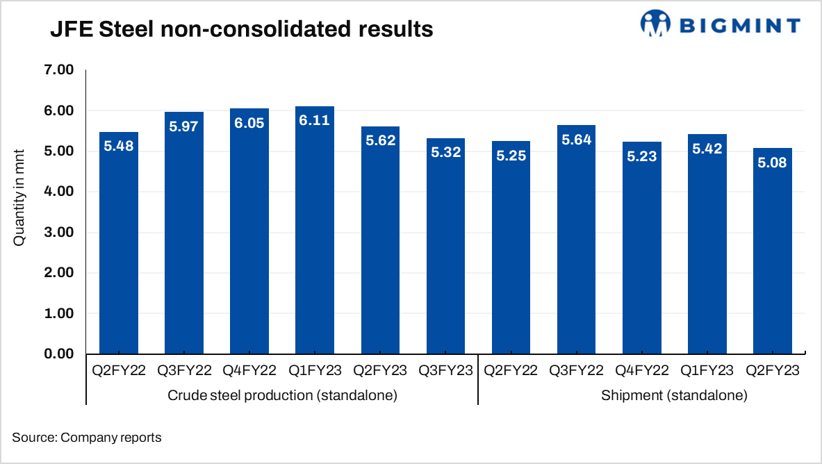Steel product shipments: Standalone steel product shipments edged down by 3% y-o-y to 5.08 mnt compared to 5.25 mnt in Q2FY22. Moreover, the same went down by 6% q-o-q against 5.42 mnt in Q2FY23.
