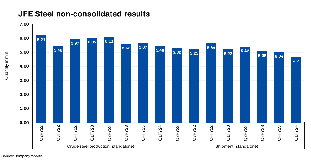 Standalone crude steel production is projected to reach approximately 23 million tonnes (mnt) annually due to a decline in automobile demand both domestically in Japan and internationally during the first half of the year. While an uptick in demand is anticipated for the second half, it is insufficient to offset the production losses incurred earlier in the year.