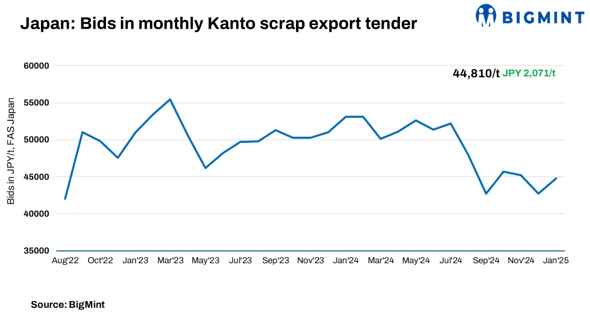 The Kanto Iron and Steel Cooperative’s Jan’25 scrap export tender saw bids rise $13/t m-o-m (JPY 2,071/t). The 15,000-t H2 lot was awarded to a Bangladeshi mill at JPY 44,810/t ($283/t) FAS. Despite limited buying interest for Japanese H2, the tender attracted higher bids. Bangladeshi buyers’ active participation, driven by domestic scrap shortages, improved LC conditions, and rising steel demand, fuelled the hike.
