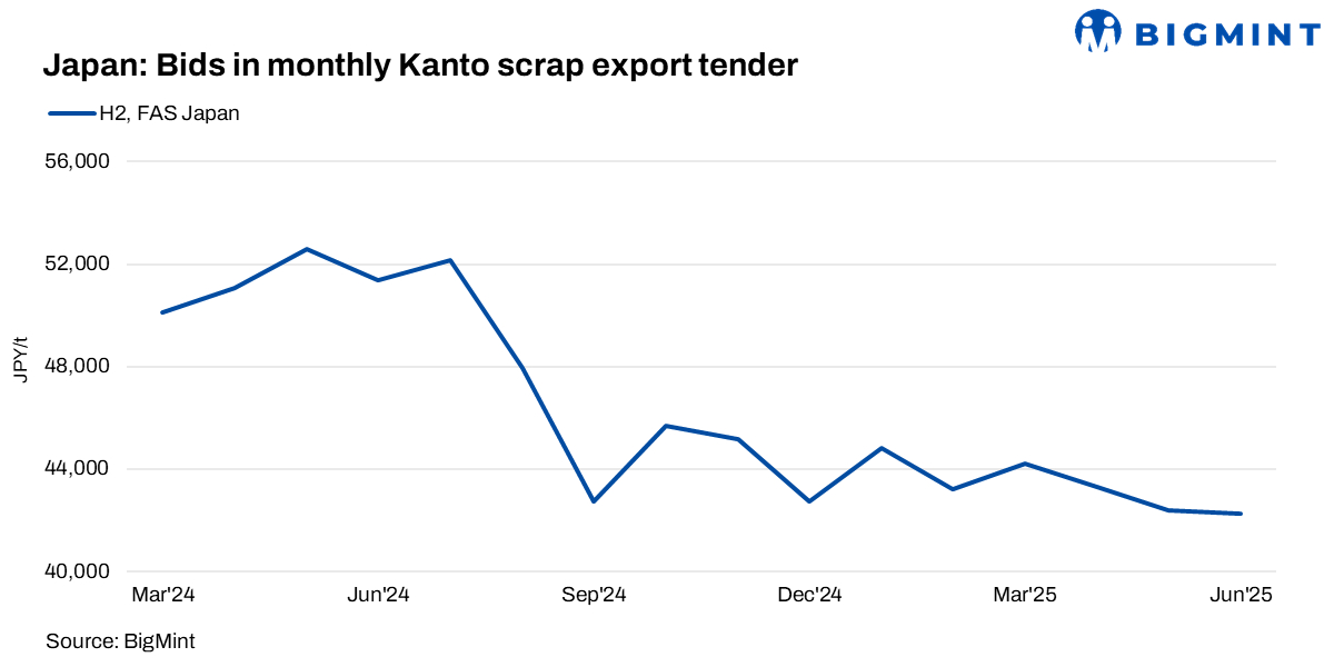 - Japan’s Kanto Tetsugen ferrous scrap tender for June concluded with a 20,000 t H2 lot awarded at JPY 42,267/t ($292/t) FAS, reflecting a drop of JPY 122/t from May.