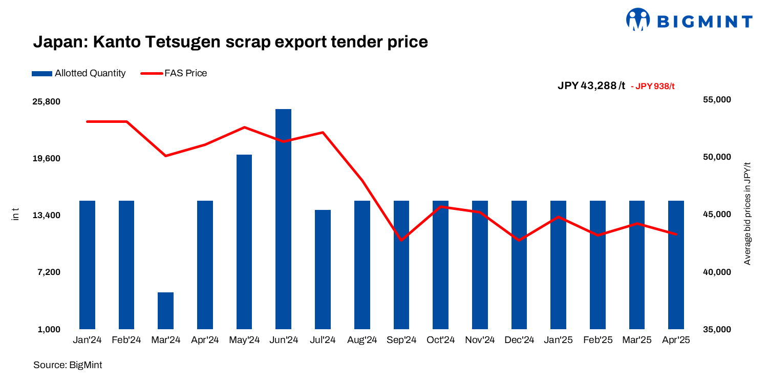 Japan’s April 2025 Kanto scrap export tender recorded a m-o-m drop in bids, with the 15,000-tonne (t) H2 scrap lot awarded to a Vietnamese mill at JPY 43,288/t ($297/t) FAS. In April, the Kanto bids were down to JPY 938/t ($6/t) m-o-m from JPY 1,026/t ($7/t) seen in March.