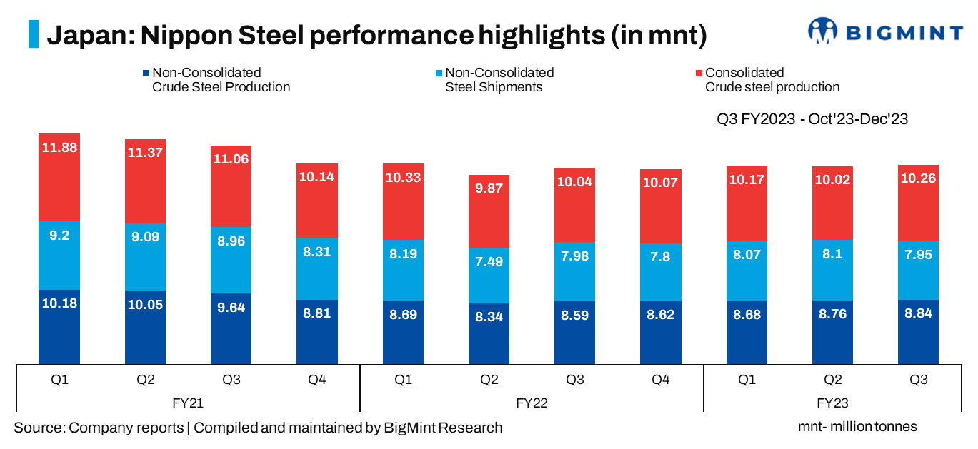 Japan’s leading steelmaker, Nippon Steel, has released its financial results for the October – December 2023 period (Q3FY’23). The company reported a slight increase in non-consolidated crude steel production and steel shipments in the quarter.