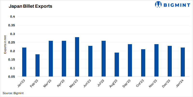 Japan: Steel billet exports fall by 3% m-o-m in Jan’24