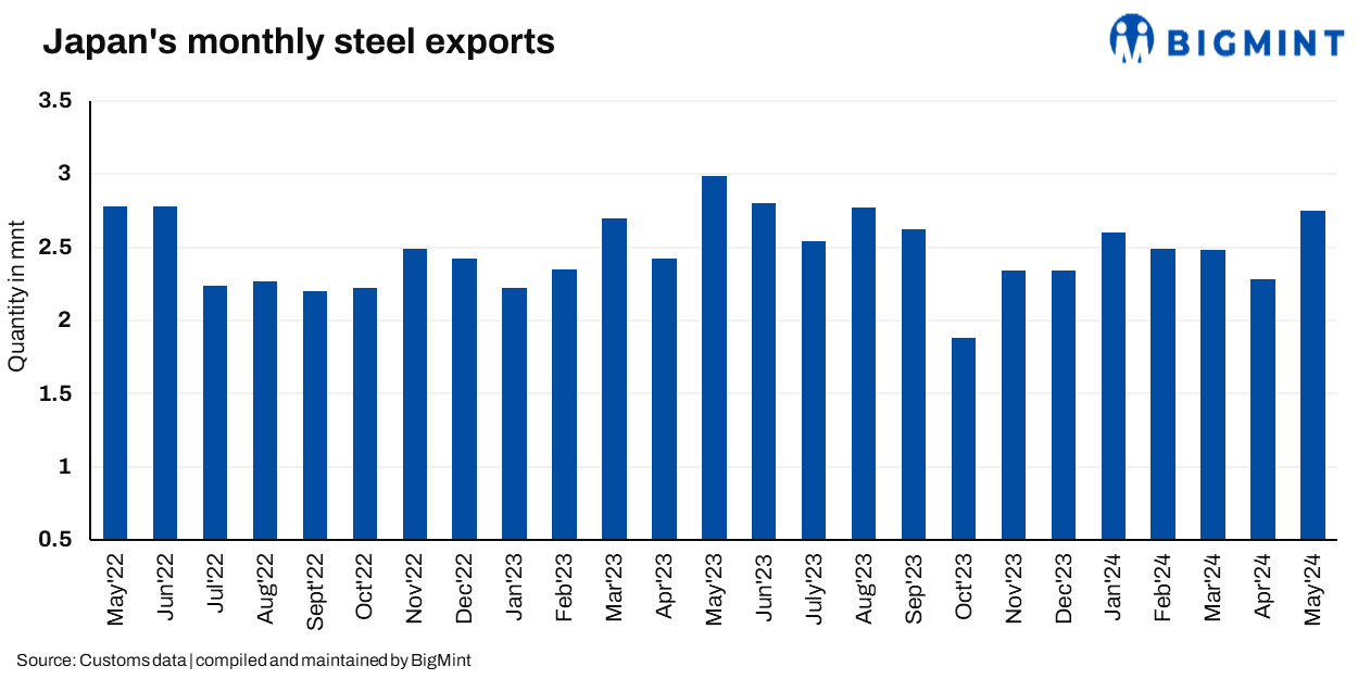 Overseas markets are weak, with HRC prices in Asia stuck around $500/t. Domestic demand is also subdued due to volatile auto industry. However, the weak yen makes exporting more attractive, pushing steel producers to prioritise export contracts. May’s steel exports represent the highest monthly export figure this year.