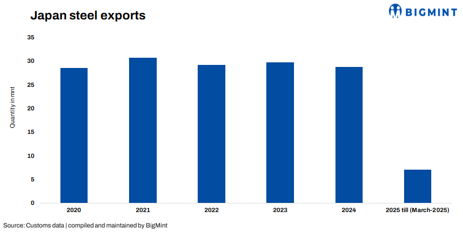 Exports to the EU plummeted by 86.9% y-o-y to just 35,000 t, driven by anti-dumping and safeguard measures targeting Japanese HRC imports.
