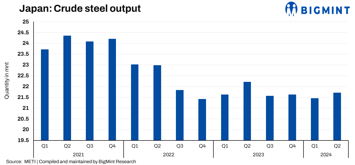 Crude steel production is expected to be 21.7 mnt, aligning with the METI’s forecast. This plan represents a 2% y-o-y decrease compared to the same period of the previous year. However, compared to the previous quarter, production is expected to increase by about 300,000 tonnes (t). This increase is partly due to increased production by electric furnace manufacturers in anticipation of summer production cuts.