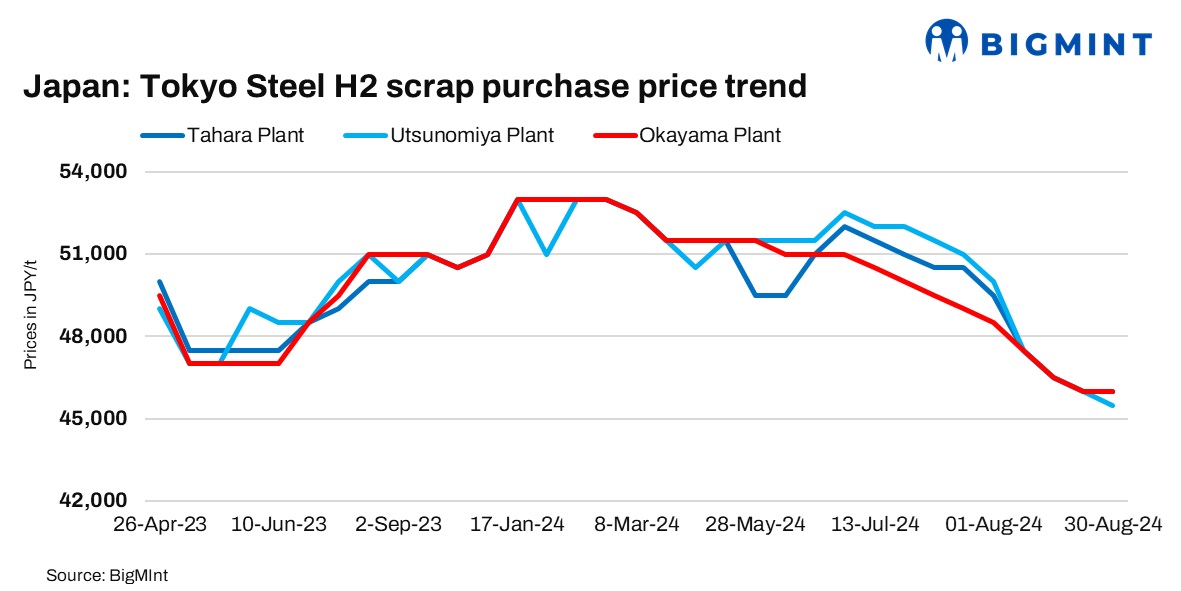 Tokyo Steel has announced a further reduction in domestic scrap procurement prices, effective 30 Aug’24. The company has lowered prices by JPY 500/t ($3/t) at its Utsunomiya plant, setting them at JPY 45,500/t ($313/t). Additionally, the prices at the Tahara and Okayama plants remained stable at JPY 46,000/t ($317/t).