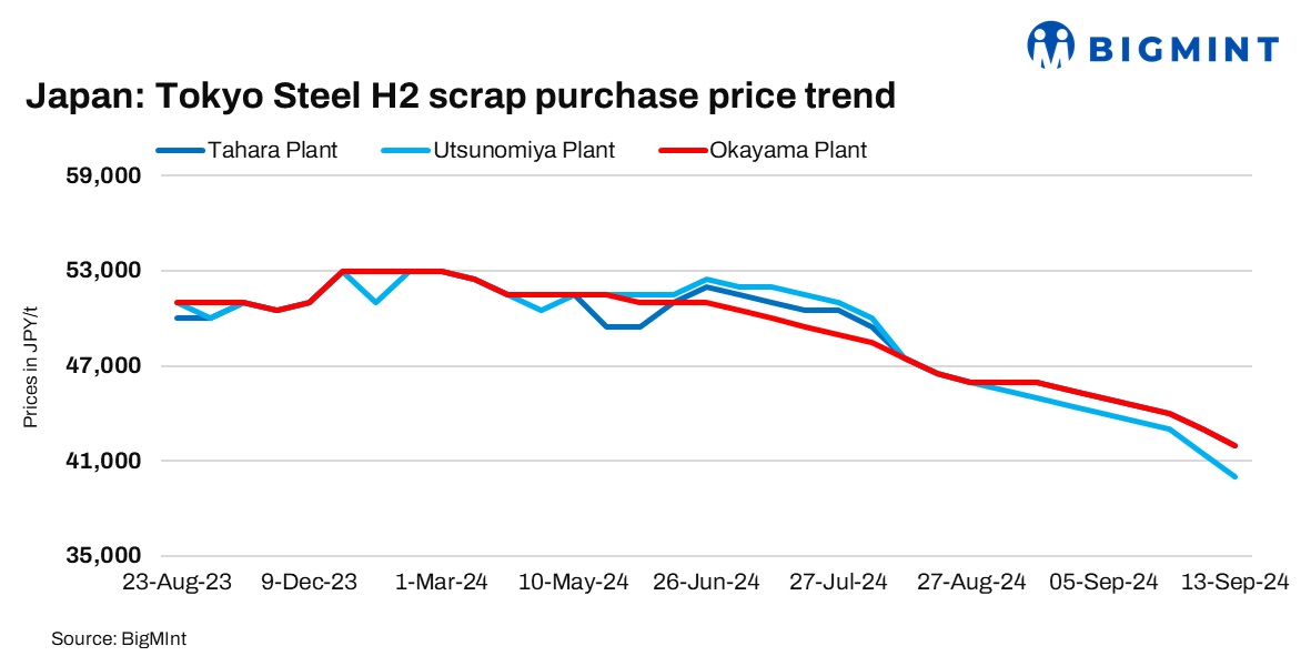 Japan’s Tokyo Steel announced its seventh consecutive cut in domestic scrap procurement prices today, reducing rates by up to JPY 1,500/t ($11/t), effective 14 Sep’24. The total decline for Sep’24 now stands at JPY 4,000-5,000/t ($28-35/t), with H2 prices ranging within JPY 40,000-42,000/t across plants. The ongoing price reductions can be attributed to high inventory levels and weak demand.