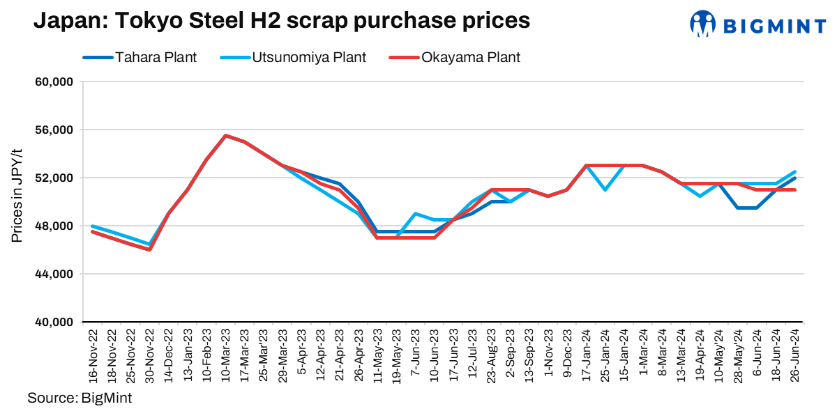 Tokyo Steel has increased scrap procurement prices by JPY 1000/t ($6/t) at Tahara, Utsunomiya and Nagoya. The new price for H2 scrap will be JPY 52,000/t ($325/t) at the Tahara plant, JPY 51,000 ($319/t) at the Nagoya plant and JPY 52,500 ($328/t) at Utsunomiya. However, the steelmaker reduced prices at Kansai by JPY 500/t ($3/t) to JPY 51,000/t ($319/t).