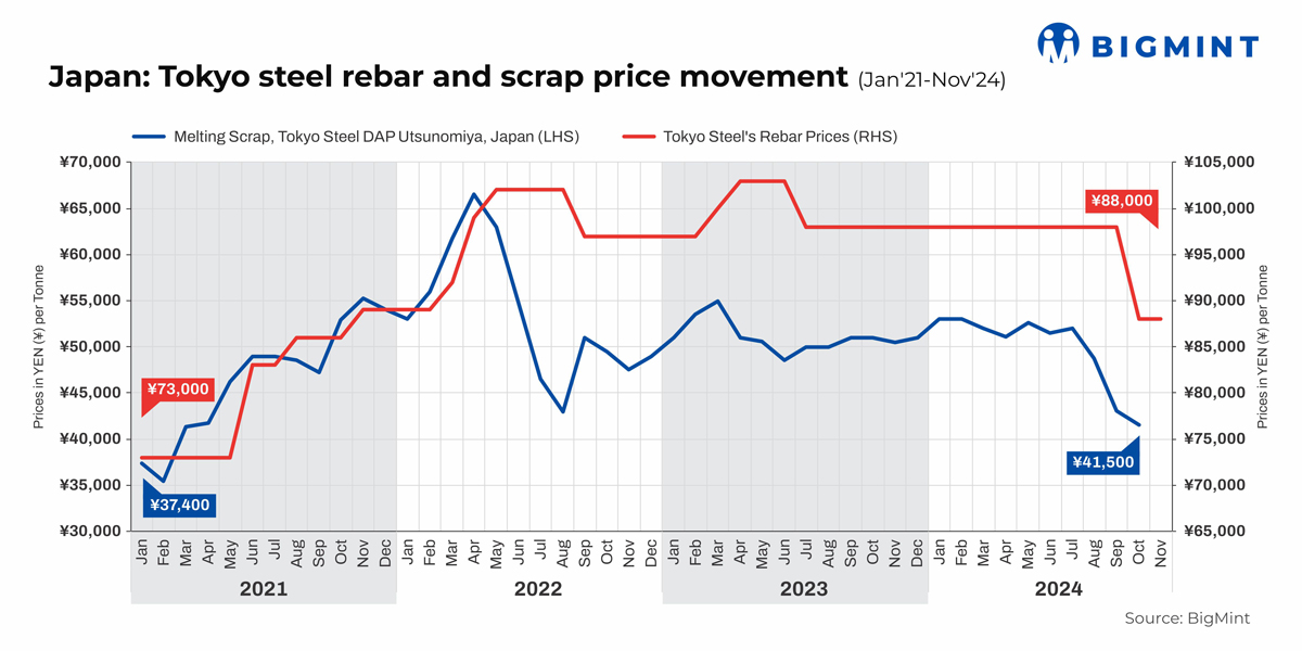 Tokyo Steel, Japan’s leading electric arc furnace steel manufacturer, rolled over prices of hot-rolled coils (HRCs) (1.7-22 mm) for November 2024 shipments compared to the last month. Additionally, the company has kept the prices of rebars and H-beams stable for the same period.