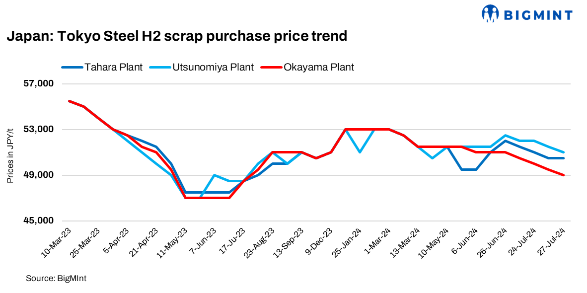 - Tokyo Steel has cut domestic ferrous scrap procurement prices for the third time this week, effective 27 Jul’24. Prices dropped by JPY 500/t ($3/t) at Okayama, Takamatsu, and Utsunomiya plants.