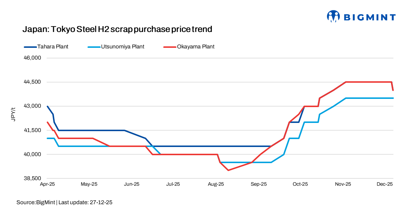 Tokyo Steel has revised scrap purchase prices effective 27 Dec’25. This marks the third price review this week followed by fourth time in month. In the latest update, the company kept scrap purchase prices unchanged across all of its plants. Prices: