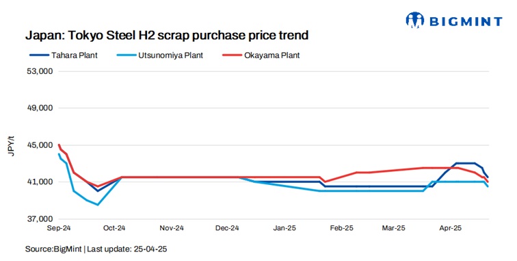 Tokyo Steel has announced its seventh scrap purchase price revision for Apr’25, effective 26 Apr. In this latest round, Tokyo Steel cut prices by JPY 500/t ($4/t) across all plants. The total price cut in April stands at up to JPY 4,500/t ($31/t).