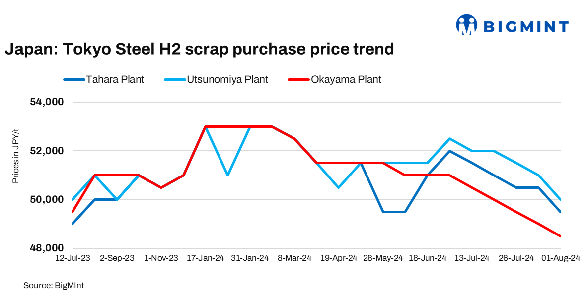Tokyo Steel has recently announced a reduction in its domestic ferrous scrap procurement prices, effective from 2 Aug’24. The company has lowered prices by JPY 1,000/t ($7/t) at its Tahara and Utsunomiya plants, setting the new price for H2 at JPY 49,500/t ($330/t) and JPY 50,000/t ($334/t), respectively. At the Okayama plant, prices dropped by JPY 500/t, bringing the new price to JPY 48,500/t ($324/t).