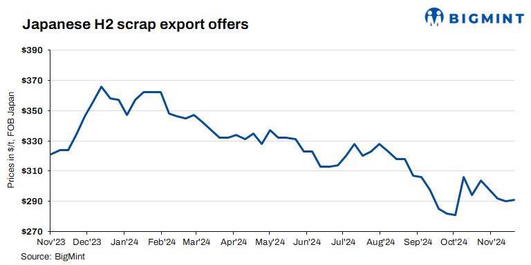 BigMint’s latest assessment placed Japanese H2 scrap export offers at JPY 45,000/t ($291/t) FOB Tokyo Bay, unchanged w-o-w.