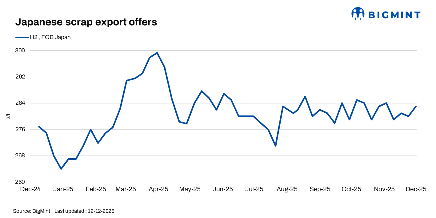 BigMint assessed Japan’s H2 scrap at JPY 44,000/t ($283/t) FOB Tokyo Bay, up JPY 300/t ($2/t, 1%) from last week.