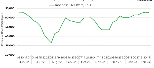 SteelMint’s assessment for Japanese H2 scrap export prices stands at JPY 52,500-53,000/t ($390-393/t) FOB, down JPY 300/t ($2/t) w-o-w.