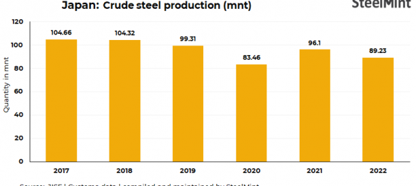 Japan’s crude steel output stood at 89.23 million tonnes (mnt) in calendar year (CY) 2022, down 7.4% y-o-y, according to data released by the Japan Iron & Steel Federation (JISF) on 23 January, 2023.