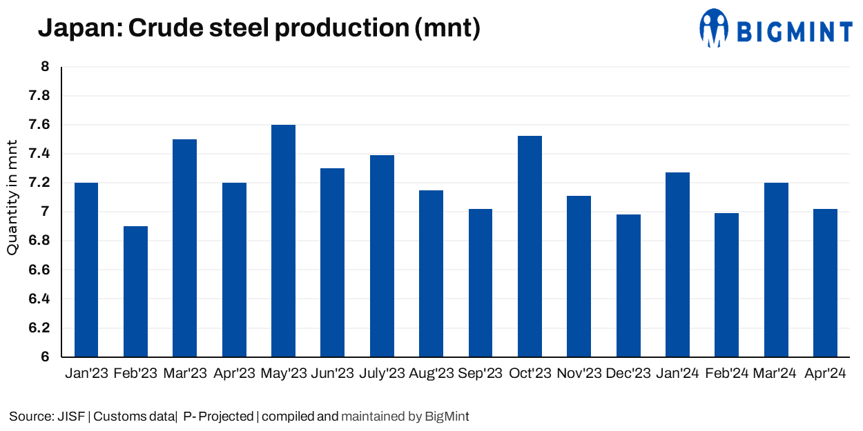 Japan’s crude steel production drops nearly 3% y-o-y in April’24