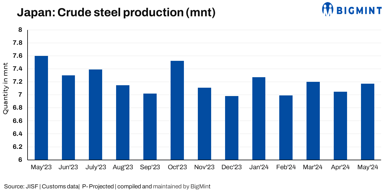 Japan’s crude steel production in May fell by 6.3% y-o-y to 7.168 million tonnes, as per Japan Iron and Steel Federation (JISF). This marks the third consecutive month of y-o-y decline. The daily production in May was 231,000 tonnes, which translates to an annualized production of around 84 mnt, a low level.