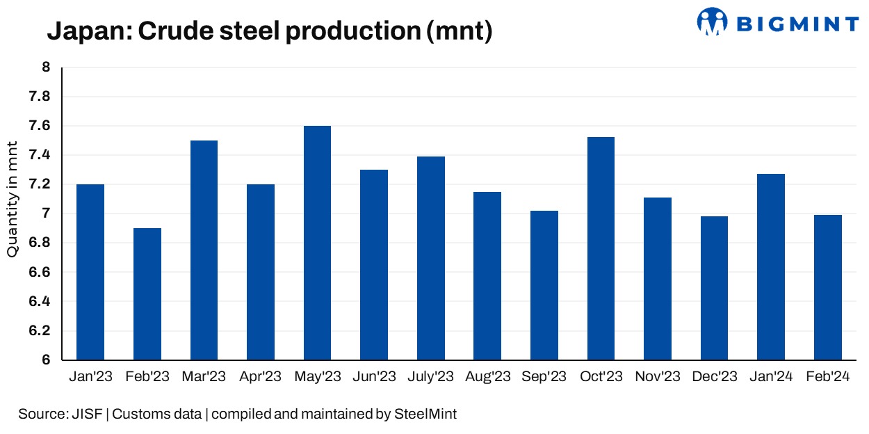 Japan’s crude steel production increases by 1.1% y-o-y in Feb’24