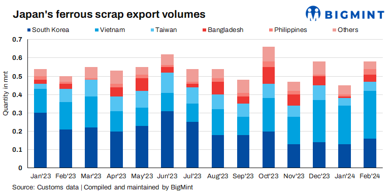 In Feb’24, Japan’s ferrous scrap exports surged by 36% from 0.44 mnt to 0.60 mnt compared to Jan’24. Annually, export volumes rose by 18% from 0.51 mnt in Feb’23. Vietnam and South Korea were the top importers at 0.26 mnt and 0.16 mnt, with Taiwan and Bangladesh following at 0.05 mnt and 0.04 mnt in Feb’24.