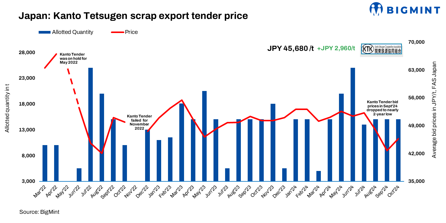 Japan’s Kanto scrap export tender bids for Oct’24 rebound post 2-month decline amid JPY depreciation