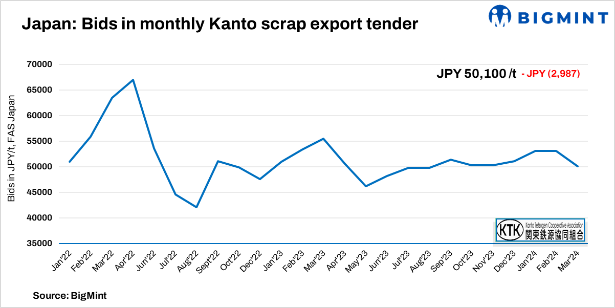 Today, Japan’s Kanto region concluded its scrap export tender for March, witnessing a significant price drop. The average bid price plummeted by JPY 2987/t ($20/t), reaching JPY 50,100/t ($340/t) FAS compared to Feb’24(JPY 53,087/t). A volume of 5,000 tonnes of H2 scrap was captured in the tender and intended for booking by a Southeast Asian country.