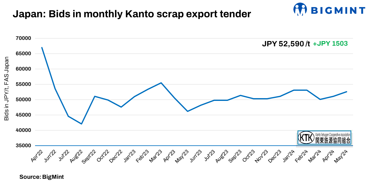 Today, Japan’s Kanto region concluded its scrap export tender for May, witnessing a rise in bids. The average bid price increased by JPY 1,503/t ($10/t), reaching JPY 52,590/t ($338/t) FAS compared to Apr’24 (JPY 51,087/t). A volume of 20,000 tonnes of H2 scrap was captured in the tender and intended for booking by a Southeast Asian country, possibly Vietnam.
