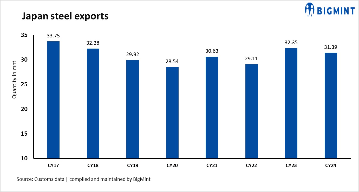 Japan Metal Daily: Japan’s steel exports declined by 3% y-o-y to 31.39 million tonnes (mnt) in CY’24, marking the first decrease in two years, according to the Ministry of Finance’s trade statistics. The decline in exports is attributed to sluggish global demand for steel, particularly for building materials, and China’s aggressive export. The steel market has also been affected by the expansion of trade measures.