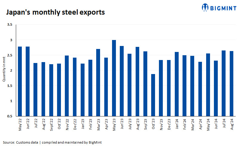 Japan Metal Daily: Japan’s steel exports fell by 5% y-o-y to 2.63 million tonnes (mnt) in August 2024 against 2.77 mnt in the same period last year. Moreover, the same inched down by 1% m-o-m against 2.65 mnt in July 2024. The export decline is attributed to a combination of sluggish overseas demand and trade restrictions.