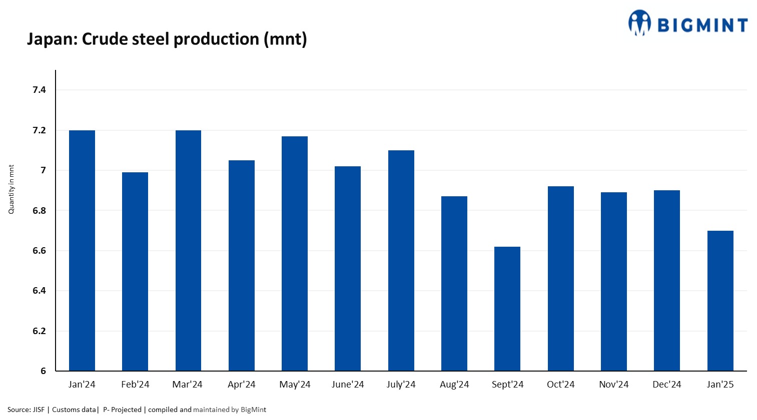 Japan Metal Daily: The Japan Iron and Steel Federation (JISF) reported a significant drop in domestic crude steel production for January. Output reached 6.787 million tonnes (mnt), a 6.6% y-o-y declined compared to the same period last year. This marks the 11th consecutive month of y-o-y decline, indicating a sustained downturn in the sector. The daily crude steel production also saw a m-o-m reduction, falling to 219,000 tonnes (t) from 223,000 t in December 2024.