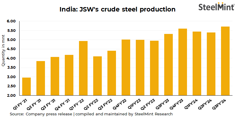 JSW Steel’s crude steel production rises, sales drop q-o-q in Q3FY24