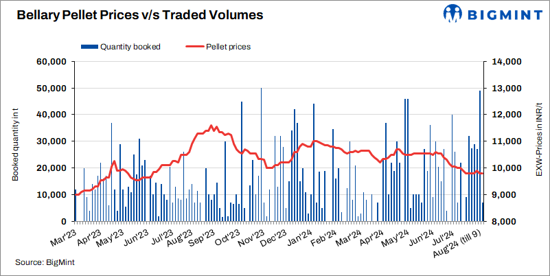 Pellet (Fe63%) prices in Bellary, Karnataka fell by INR 150/t ($2/t) to INR 9,650/t ($115/t) exw on 9 Aug’24 compared to 6 Aug’24. Around 44,000 t of deals were recorded at INR 9,500-9,800/t in this publishing window. Active deals at lower offers and pressure from sponge and finished steel dragged down pellet prices. Sponge iron (P-DRI) prices decreased by INR 350/t w-o-w to INR 25,650/t exw today.