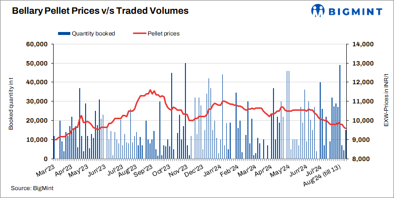 Pellet (Fe63%) prices in Bellary, Karnataka dropped by INR 50/t ($1/t) to INR 9,600/t ($114/t) exw on 13 Aug’24 compared to 9 Aug’24. Around 15,000 t of deals were recorded at INR 9,500-9,700/t in this publishing window. Pellet producers have lowered their offers, which have attracted buyers to conclude deals at reduced prices. However, Sponge iron (P-DRI) prices increased by INR 200/t w-o-w to INR 25,900/t exw today.
