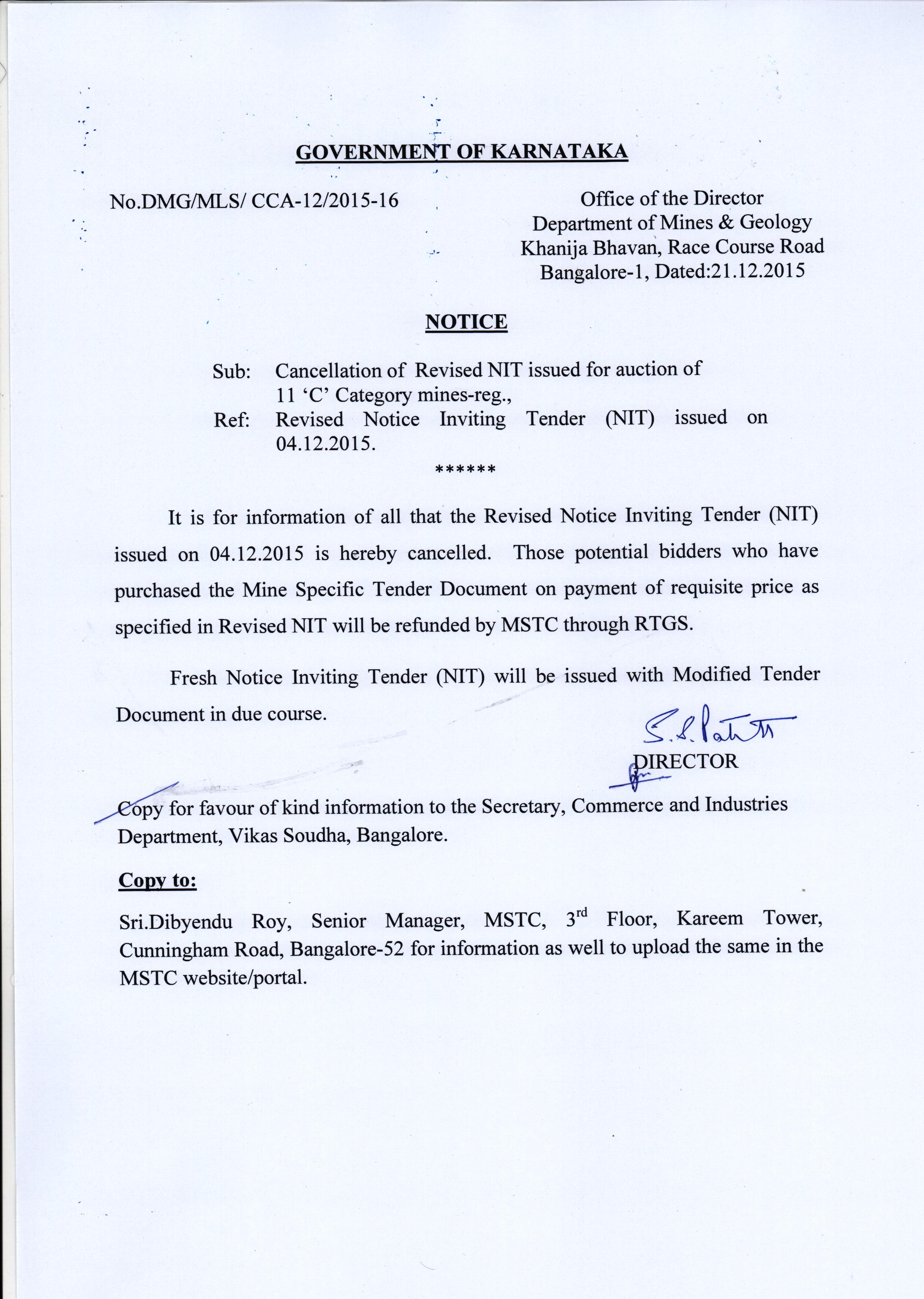 On 21 Dec’15, the DMG has notified that tender issued on 30 Nov’15, regarding the same will be cancelled. However, the potential bidders, who have already purchased the respective document on requisite price will be refunded with the same amount by MSTC.