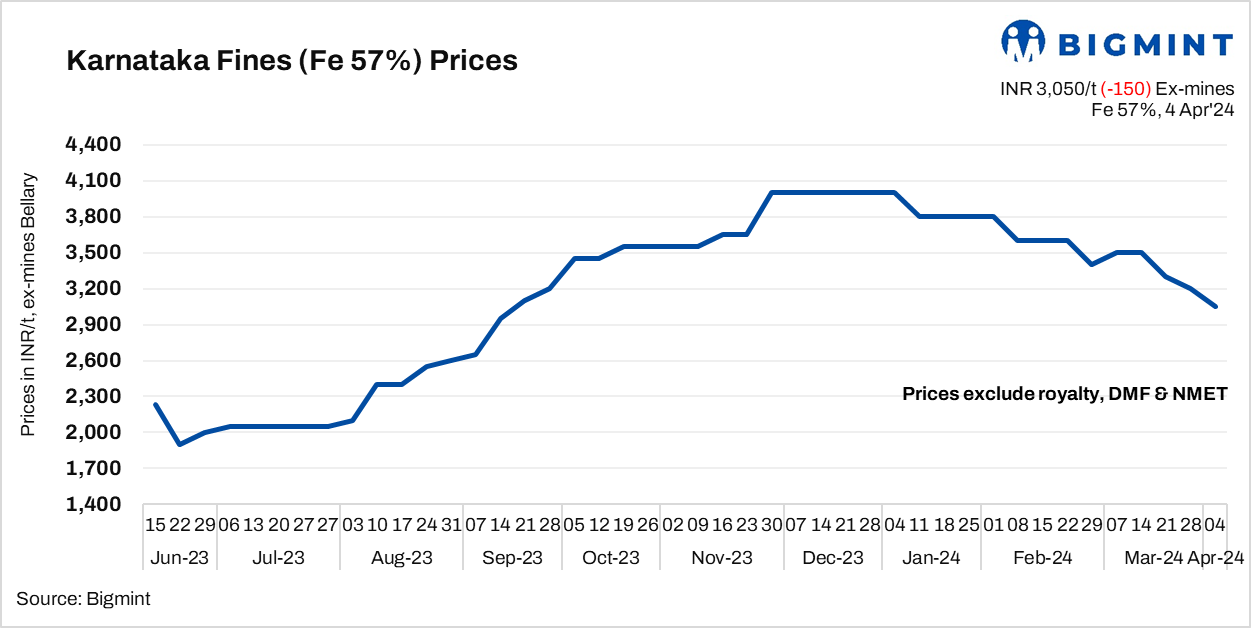 On the other hand, BigMint’s weekly Indian low-grade iron ore fines (Fe 57%) export index continued to head south by around $3/t w-o-w to $55.5/t FOB east coast on 4 April, 2024. “Domestic prices continue to fall as export index is also weak. Along with it, we are also left with zero inventories,” said another Karnataka-based miner to BigMint. Iron ore export prices remained under pressure amid lack of deals from India. The Chinese buyers had gone for Qingming holidays (4-6 April, 2024) and no major deals have been concluded in recent days. Meanwhile, sellers took a cautious stance and observed the market situation amid poor market fundamentals.
