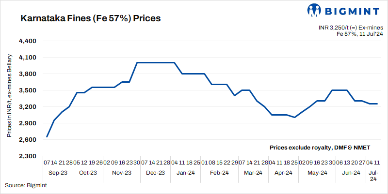 - Weak export sentiments weigh on domestic prices: BigMint’s weekly Indian low-grade iron ore fines (Fe 57%) export index decreased by $4/t w-o-w to $59/tonne (t) FOB east coast on 11 July 2024 . The significant drop in iron ore spot and future prices amid the lower steel demand in the Chinese market have weighed on export prices. However, buyers planned to purchase cargo at cheaper prices from India following cost-effectiveness and saving on the import margins.