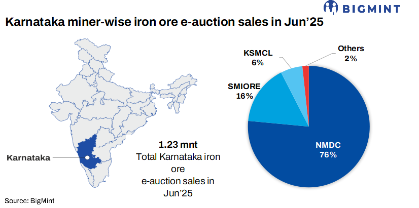 NMDC auctioned 185,000-t iron ore from Kumaraswamy, Karnataka, on 23 Jul’25. The entire quantity was booked, commanding premiums of up to INR 1,180/t for lumps and INR 1,510/t for fines. Specifically, 77,000-t lumps (10-40 mm, Fe 57.37-64.17%) were sold at INR 4,002-6,181/t against base prices INR 3,531-5,401/t. Meanwhile, 108,000-t fines (Fe 58.15-62.61%) were booked at INR 3,359-5,683/t against base prices INR 3,170-4,173/t. Prices include royalty, DMF, NMET.
